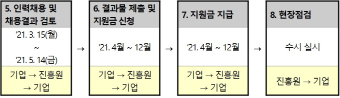 지원내용은 신규채용인력 1인당 인건비(월 최대 200만 원)의 90%(180만 원 / 10%는 기업 부담)와 직무 교육비를 지원한다.