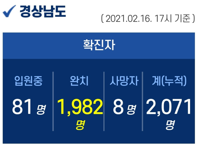 16일 오후 5시 기준 경남도내 누적 확진자 2071명 중 입원 81명 퇴원 1982명 사망 8명이다.