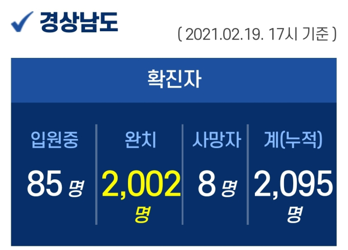 19일 오후 5시 기준, 확진자는 85명, 퇴원 2002명, 사망 8명, 누적 확진자는 총 2095명이다.
