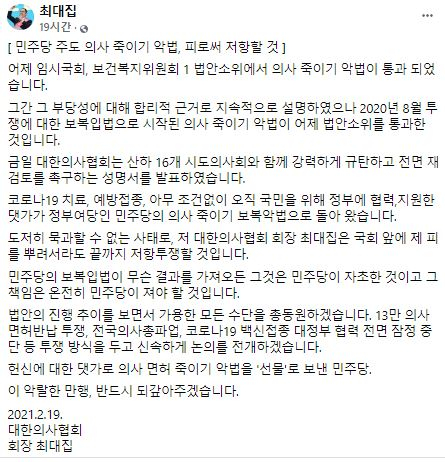 20일 의료계에 따르면 대한의사협회는 의사 면허 반납, 코로나19 백신 협력 중단 등을 두고 의사면허 취소법(의료법 개정안)에 따른 대응 수위 논의에 들어갔다. 최대집 의협 회장은 전날 SNS를 통해 “법안의 진행 추이를 보면서 가용한 모든 수단을 총동원하겠다. 13만 의사 면허반납 투쟁, 전국의사총파업, 코로나19 백신접종 대정부 협력 전면 잠정 중단 등 투쟁 방식을 두고 신속하게 논의를 전개하겠다”고 밝혔다.