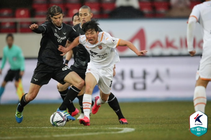 제주는 원정팀이지만 전반전 초반부터 성남을 강하게 압박했다. 경기 초반 두 차례 유효슈팅을 시도하며 기세를 가져갔다. 이후에도 전방부터 프레싱을 시도하며 성남의 실책을 유도했다. 성남은 제주의 압박에 제대로 전진을 하지 못했다.