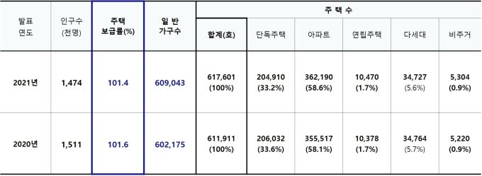 한편, 주택보급률이 작년보다 0.2% 낮아진 원인에 대해 김준열 국장은 "1인 또는 2인 가구수가 증가(7,468)함에 따라 주택보급률이 낮아졌다"고 브리핑을 통해 발표했다. 하지만, 모 부동산 중개인은"주택가격을 주도하는 아파트 매매 가격의 급상승과 대출을 받을 수 있는 금액이 서민들에게는 한정적이라 주택을 구매하기 어렵기 때문"이라고 밝혔다.