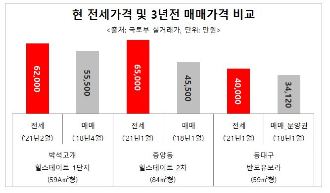 경기도 성남시 중앙동에 ‘중앙동 힐스테이트 2차’ 전용 84㎡형은 지난 1월 6억5000만원(15층)에 전세 거래가 이뤄졌다. 동일 주택형은 2018년 1월 4억5500만원(15층)에 매매 거래가 이뤄졌다. 3년 전 매매가에 2억원을 더 지불해야만 전셋집을 구할 수 있는 셈이다.