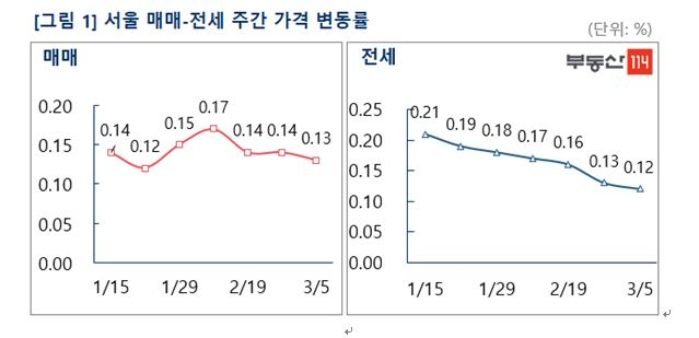 한편 부동산114는 전세시장에 대해 일부 단지를 중심으로 매물 소진이 더디게 진행되면서 서울, 경기·인천, 신도시 모두 오름세가 둔화된 것으로 조사했다. 지역별로는 서울이 0.12% 상승했고 경기·인천과 신도시가 각각 0.09%, 0.05% 올랐다.
