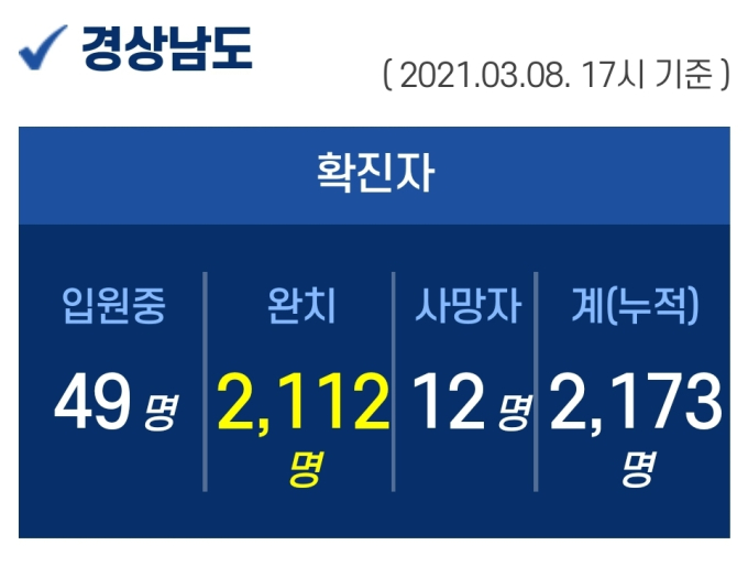 8일 오후 5시 기준, 경남도내 입원 중인 확진자는 49명이고, 퇴원 2112명, 사망 12명, 누적 확진자는 총 2173명이다.