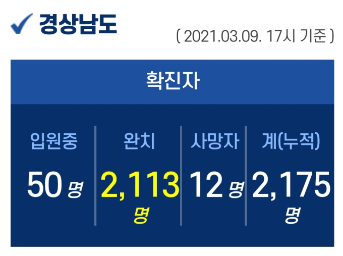 9일 오후 5시 기준, 경남도내 입원 중인 확진자는 50명이고, 퇴원 2113명, 사망 12명, 누적 확진자는 총 2175명이다.