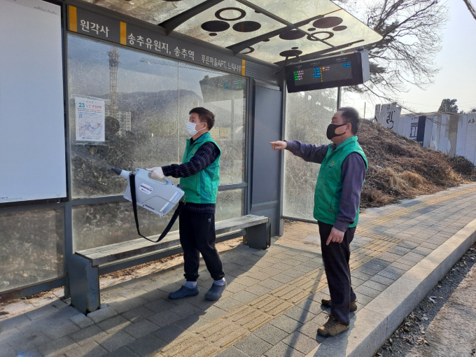 장흥면 관내 버스정류장 76곳을 대상으로 코로나19 확산방지를 위한 자율 방역봉사를 전개하고 있다고 밝혔다.