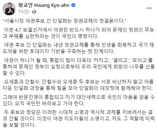 황 전 대표는 16일 SNS를 통해 "이번 4·7 보궐선거에서 야권은 반드시 하나가 돼 문재인 정권의 무능과 무패를 심판하라는 것이 국민의 명령"이라면서 이같이 밝혔다.