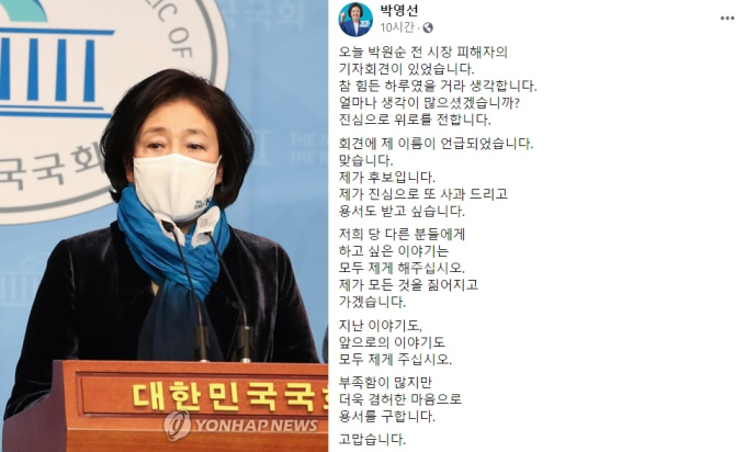 앞서 성추행 사건 피해자 A씨는 이날 오전 기자회견을 열고 "저를 피해호소인이라고 명명했던 의원들이 직접 저에게 사과하도록 박영선 후보님께서 따끔하게 혼내줬으면 좋겠다"고 말한 바 있다. A씨를 피해호소인이라 부른 고민정·남인순·진선미 민주당 의원은 현재 박 후보 캠프에서 활동하고 있다.