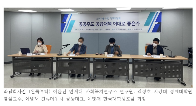 소비자정책 감시단체 컨슈머워치는 18일 ‘공공주도 공급대책 이대로 좋은가’라는 주제로 좌담회를 개최했다. 이날 좌담회는 소비자 입장에서 공공주도 부동산 공급대책의 문제점을 살펴보고, 현실적인 방안을 찾기위한 취지에서 열렸다.