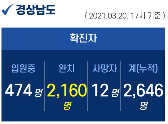 20일 오후 5시 기준, 경남도내 입원 중인 확진자는 472명이고, 퇴원 2162명, 사망 12명, 누적 확진자는 총 2646명이다.