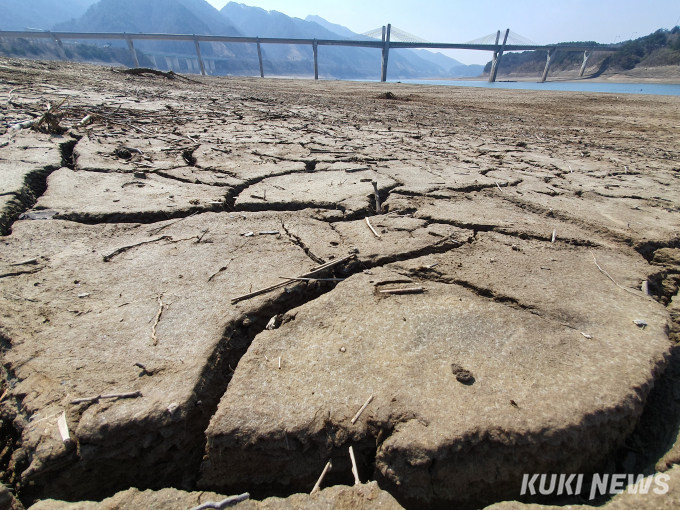 [인제=쿠키뉴스] 한윤식 기자 =강원지역에 겨울가뭄이 지속되면서 25일 오후 인제군 남면 38대교 인근 소양호가 바닥을 드러내며 거북이등처럼 갈라져 있다.