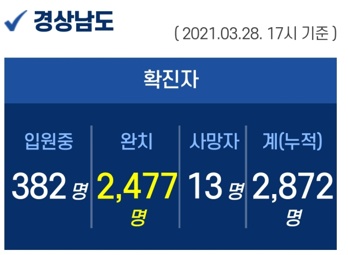 28일 오후 5시 기준, 경남도내 입원 중인 확진자는 382명이고, 퇴원 2477명, 사망 13명, 누적 확진자는 총 2872명이다.