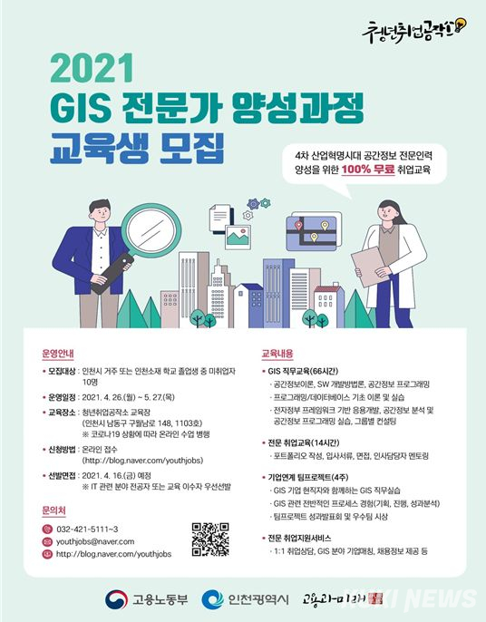 [인천=쿠키뉴스 이현준 기자] 인천시는 청년취업공작소와 연계해 오는 4월 16일까지 100% 국비 지원 무료교육으로 진행되는 지리정보시스템(GIS) 전문가 양성과정 교육생을 모집한다고 29일 밝혔다.