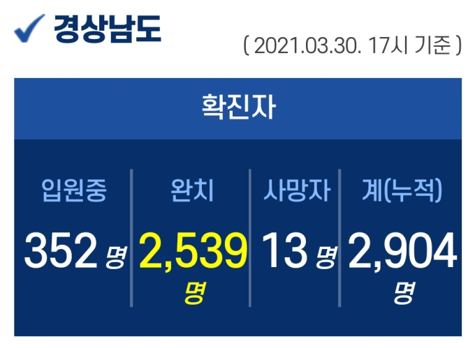 30일 5시 기준, 경남도내 입원 중인 확진자는 352명이고, 퇴원 2539명, 사망 13명, 누적 확진자는 총 2904명이다.