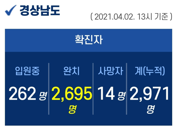 2일 1시 30분 기준, 경남도내 입원 중인 확진자는 262명이고, 퇴원 2695명, 사망 14명, 누적 확진자는 총 2971명이다.