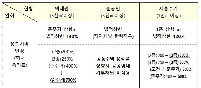 주민들이 복합개발 사업에 참여할 경우 수익과 직결된 용적률 혜택을 받게 된다. 정부는 공공 개발에 법정상한의 최대 140%(최고 700%)까지 용적률을 높여주겠다는 계획이다. 정부의 추산 결과 공공 재개발이 민간 재개발 보다 111%p(민간 269%, 공공 380%)까지 더 높은 용적률을 적용할 수 있는 것으로 나왔다.