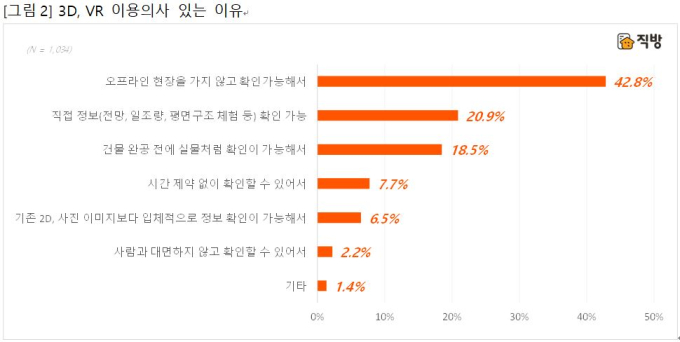 3D나 VR 부동산정보를 이용할 의사가 있는 이유는 ‘오프라인 현장을 가보지 않고 확인할 수 있어서’가 42.8%로 가장 많았다. 이어 ▲직접 동작하면서 전망, 일조량, 평면구조 등 확인이 가능해서(20.9%) ▲건물 완공 전에 실물처럼 확인이 가능해서(18.5%) 등의 순으로 나타났다.