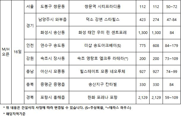 모델 하우스는 ▲덕소 강변 스타힐스 ▲화성 태안 우미 린 센트포레 ▲더샵 송도아크베이 ▲속초 영랑호 엘크루 라테라 ▲힐스테이트 모종 네오루체 ▲송산지구 칸타빌 ▲한화 포레나 포항 등 모두 16일 개관한다.