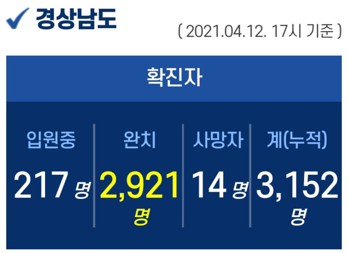 12일 오후 5시 기준, 경남도내 입원 중인 확진자는 217명이고, 퇴원 2921명, 사망 14명, 누적 확진자는 총 3152명이다.