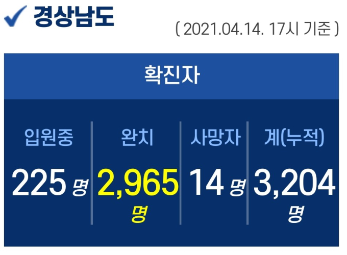 14일 오후 5시 기준, 경남도내 입원 중인 확진자는 225명이고, 퇴원 2965명, 사망 14명, 누적 확진자는 총 3204명이다.