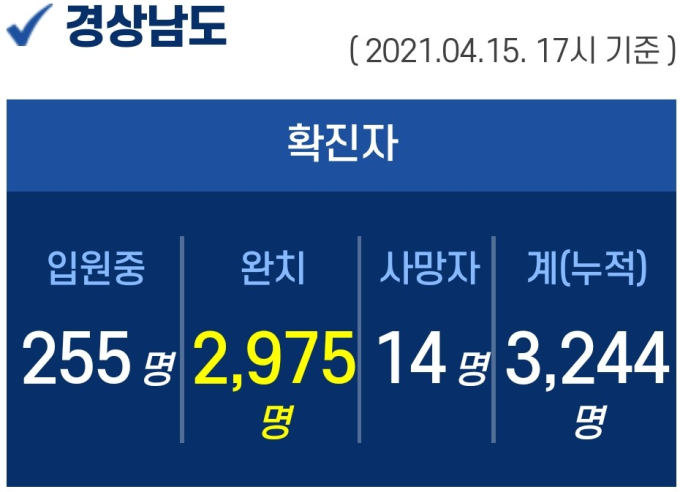 15일 오후 5시 기준, 경남도내 입원 중인 확진자는 255명이고, 퇴원 2975명, 사망 14명, 누적 확진자는 총 3244명이다.k123@kukinews.com