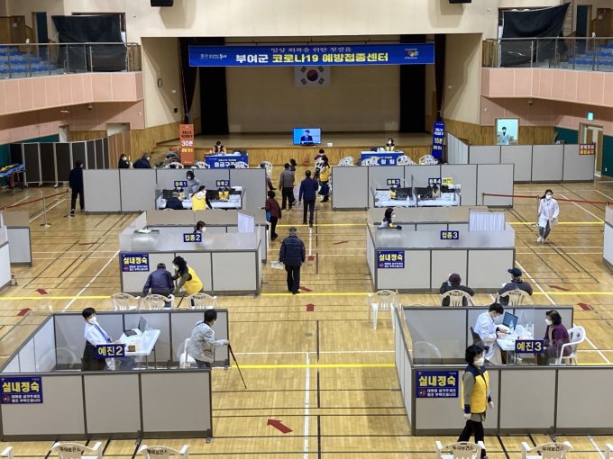 [부여=쿠키뉴스] 오명규 기자 =부여군(군수 박정현)은 15일 규암면 소재 부여국민체육센터 실내체육관에 코로나 예방접종센터를 개소하고 본격 운영에 들어갔다.