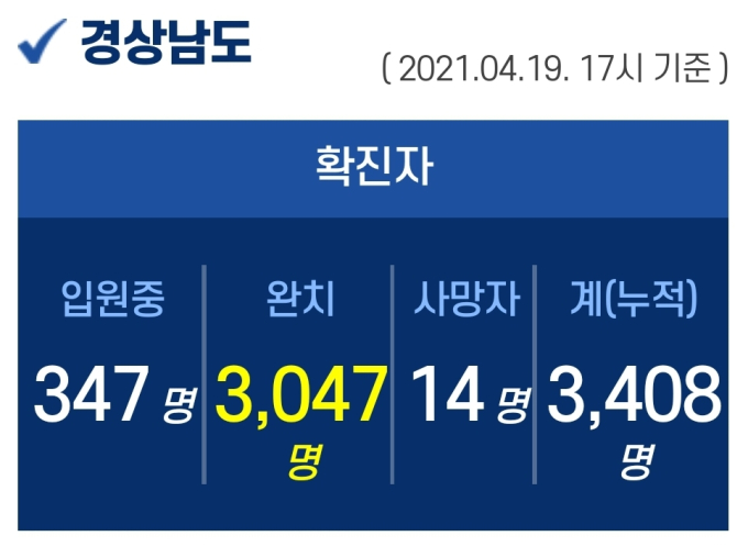 19일 오후 5시 기준 경남도내 입원 중인 확진자는 347명이고, 퇴원 3047명, 사망 14명, 누적 확진자는 총 3408명이다.