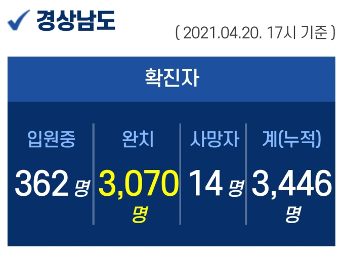 20일 오후 5시 기준, 경남도내 입원 중인 확진자는 362명이고, 퇴원 3070명, 사망 14명, 누적 확진자는 총 3446명이다.