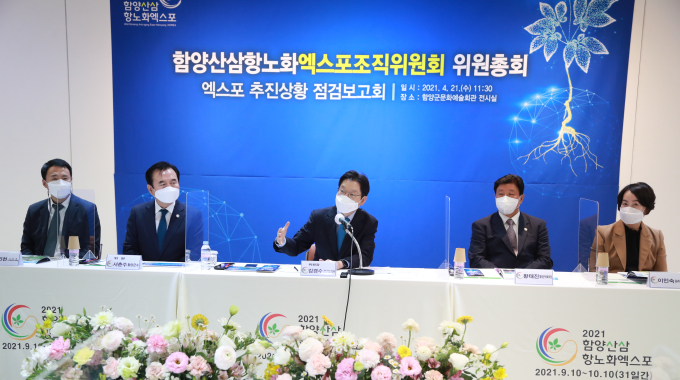 조직위원장인 김 지사는 21일 오전 엑스포 제1행사장인 상림공원 내 함양군문화예술회관에서 진행된 2021 함양산삼항노화엑스포 추진상황 점검보고회를 주재하고 "함양산삼의 우수성, 효능, 특성이 제대로 알려지고 향후 국내 바이오산업의 중요한 물질이 되도록 만들어가야 한다"며 이같이 말했다.