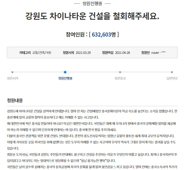 한편 강원도가 홍천군 일원에 추진 중인 한중문화타운과 관련 '차이나타운'이 조성되는 계획을 두고 국민적 반발이 거세지고 있는 가운데 지난달 29일 올라온 '강원도 차이나타운 건설을 철회해 주세요'라는 제목의 청원글은 이날 오후 1시50분 기준 63만2603명의 동의를 얻었다.
