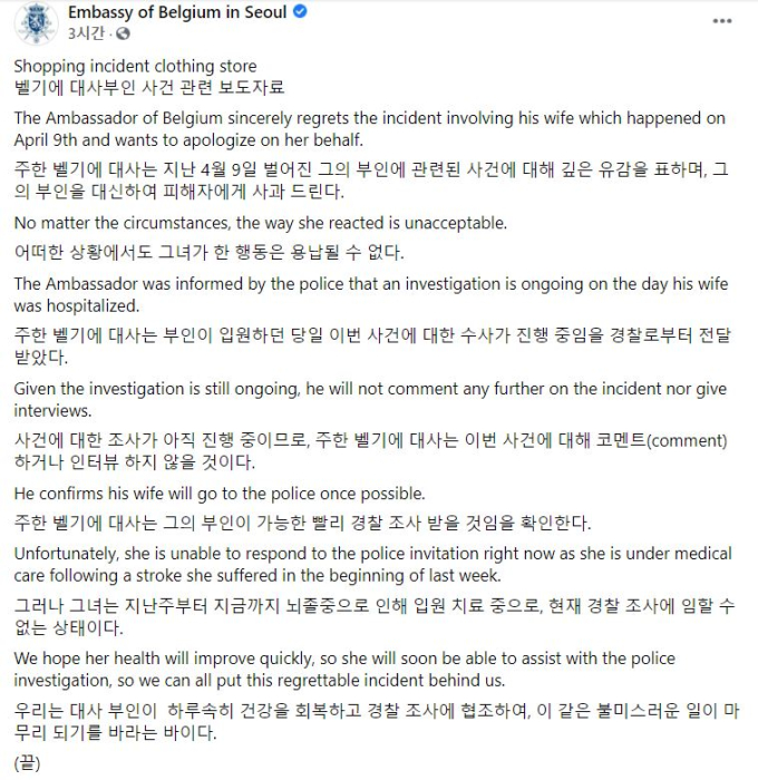 피터 레스쿠이에 벨기에 대사는 22일 오전 주한 벨기에 대사관 SNS 등을 통해 사과문을 발표했다. 사과문은 영문과 이를 번역한 국문으로 표기됐다.