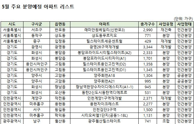 28일 부동산정보업체 부동산114에 따르면 5월 전국 분양예정 아파트는 총 7만1392가구(4월 26일 기준, 임대포함·총가구수)다. 봄 분양철 영향과 4월 분양이 미뤄진 물량이 넘어오면서 두 달 연속 7만대 분양예정 물량을 기록했다.지역별로는 수도권에서 3만7901가구, 지방에서 3만3491가구가 분양에 들어갈 예정이다. 수도권에서는 경기도가 2만3353가구로 가장 많은 물량을 보였고, 뒤이어 인천(9925가구), 서울(4623가구) 순이다. 경기도는 전달 보다 물량이 8000가구 가량 늘었으며, 서울은 4월 분양이 지연된 서초구 반포동 래미안원베일리, 중구 입정도 힐스테이트세운센트럴를 제외하면 동작구 상도동 푸르지오(771가구)만 유일한 신규 물량이다.