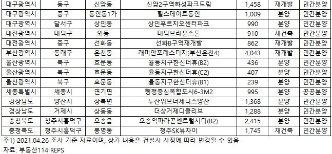 지방에서는 ▲부산 4344가구 ▲대구 6452가구 ▲광주 1312가구 ▲대전 1772가구 ▲울산1613가구 ▲강원도 481가구 ▲경상남도 4059가구 ▲전라남도 1216가구 ▲전라북도 1005가구 ▲충청남도 5085가구 ▲충청북도 4160가구 ▲세종시 995 가구의 분양이 예정돼 있다.