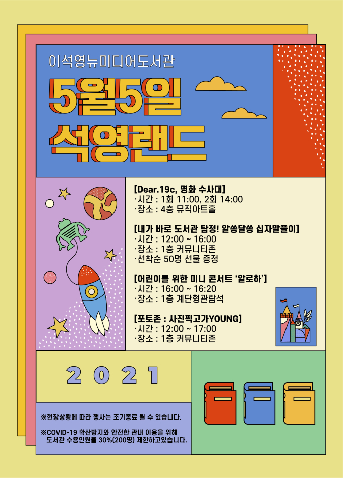 시 관계자는 "어린이날 '석영랜드' 행사를 통해 코로나 팬데믹으로 지친 어린이들이 이석영뉴미디어도서관에서 힐링의 시간을 갖길 기대한다"며 "안전한 행사 진행을 위해 행사 전 휴관일에 도서관 시설 전체를 소독하고, 행사 당일 참여자에 대한 방역지침을 철저히 준수해 운영할 예정"이라고 말했다.