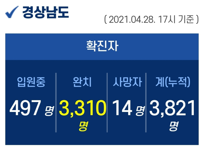 28일 오후 5시 기준, 경남도내 입원 중인 확진자는 497명이고, 퇴원 3310명, 사망 14명, 누적 확진자는 총 3821명이다.