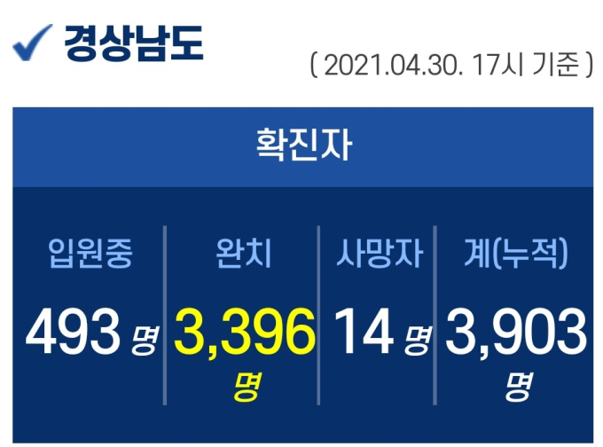 30일 오후 5시 기준, 경남도내 입원 중인 확진자는 493명이고, 퇴원 3396명, 사망 14명, 누적 확진자는 총 3903명이다.