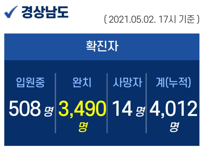 2일 오후 5시 기준, 경남도내 입원 중인 확진자는 508명이고, 퇴원 3490명, 사망 14명, 누적 확진자는 총 4012명이다.