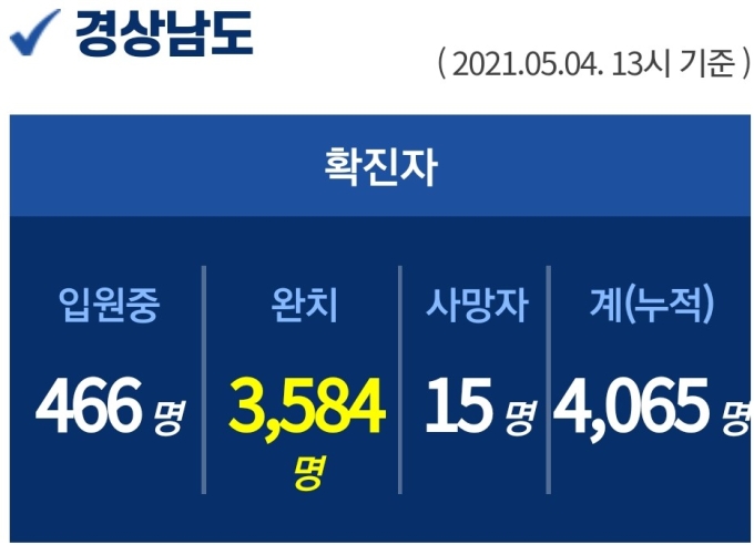 4일 오후 1시 30분 기준, 경남도내 입원 중인 확진자는 466명이고,퇴원 3584명, 사망 15명, 누적 확진자는 총 4065명이다.