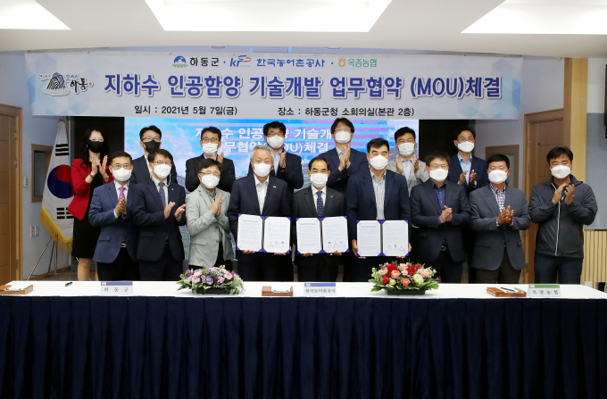 이번 업무협약은 지하수조사전문기관인 한국농어촌공사가 물 자립을 선도하는 하동군 및 민·관 협력의 가교역할을 하는 옥종농협과 함께 하동군 시설농업단지의 물 부족 해소를 위해 지하수 인공함양 개발사업의 전 주기적 협력을 추진하기 위한 것이다.