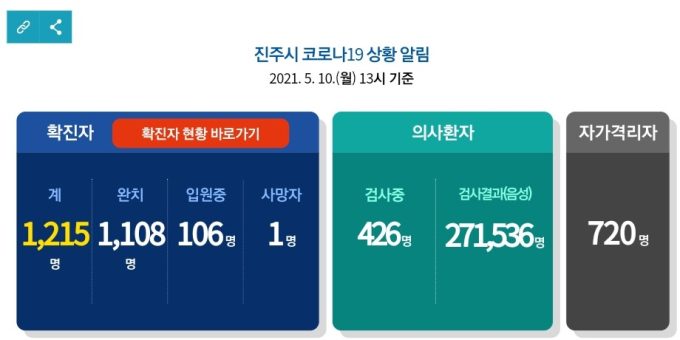 10일 현재 진주시 누적 확진자 1215명 중 완치자는 1108명이며 106명은 입원, 자가격리자는 720명이다.