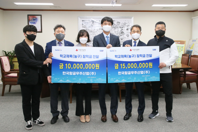 [사천=쿠키뉴스] 강연만 기자 = 한국항공우주산업(주)(대표 안현호)이 10일 사천시청에서 학교체육과 사천시 여자농구 발전을 위해 써 달라며 2500만원의 장학금을 기탁했다.