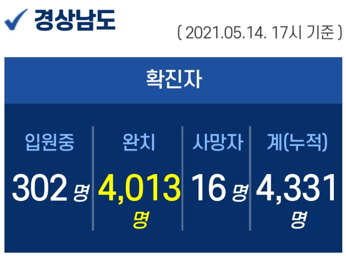 14일 오후 5시 기준 경남도내 입원 중인 확진자는 302명이고, 퇴원 4013명, 사망 16명, 누적 확진자는 총 4331명이다.