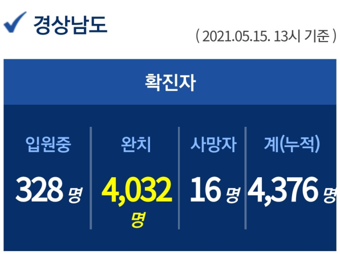 15일 오후 1시 30분 기준 경남도내 입원 중인 확진자는 328명이고, 퇴원 4032명, 사망 16명, 누적 확진자는 총 4376명이다.