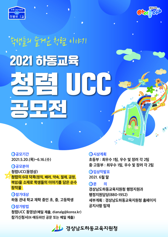 공모된 작품은 자체심사위원회를 통해 초등부, 중·고등부로 나누어 각 부별로 최우수 1팀, 우수 2팀, 장려 3팀을 선발할 예정으로 수상자에게는 교육장 상과 부상이 수여되며, 선정된 청렴UCC는 유튜브 '경상남도하동교육지원청 청렴채널'에 공개해 청렴교육 홍보 자료로 활용될 예정이다.
