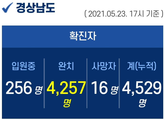 23일 오후 5시 기준, 경남도내 입원 중인 확진자는 256명이고, 퇴원 4257명, 사망 16명, 누적 확진자는 총 4529명이다.