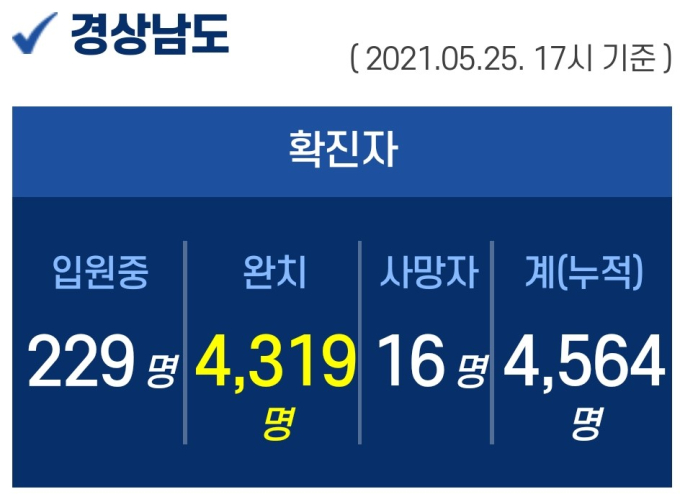 25일 오후 5시 기준 경남도내 입원 중인 확진자는 229명이고, 퇴원 4319명, 사망 16명, 누적 확진자는 총 4564명이다.