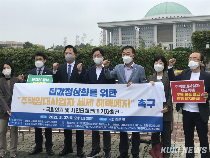 참여연대, 경제정의실천시민연합, 집값정상화시민행동 등 10여개 단체는 전날 국회 앞에서 기자회견을 열고 “임대사업자 세제 혜택은 부동산 투기를 부추기는 투기조장 정책”이라며 폐지를 강력 주장했다. 행사에는 더불어민주당 의원들도 여럿 참석했다.