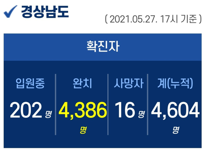 27일 오후 5시 기준 경남도내 입원 중인 확진자는 202명이고, 퇴원 4386명, 사망 16명, 누적 확진자는 총 4604명이다.