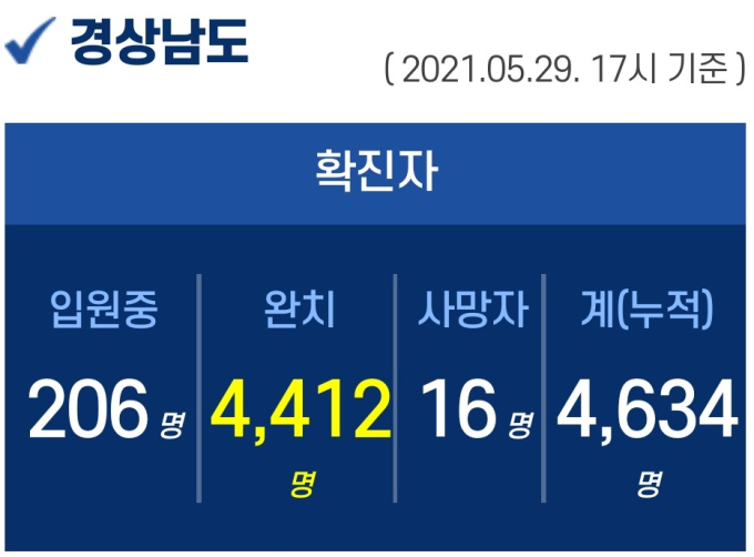 29일 오후 5시 기준 경남도내 입원 중인 확진자는 206명이고, 퇴원 4412명, 사망 16명, 누적 확진자는 총 4634명이다.